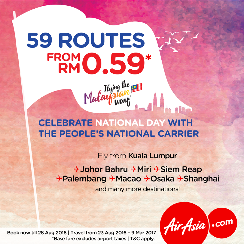 In conjunction with Malaysia’s 59th National Day which falls on 31 August 2016, AirAsia has a special deal for domestic and international destinations. Destinations include but not limited to Johor Bahru, Miri, Siem Reap, Palembang, Macao, Osaka and Shanghai.
